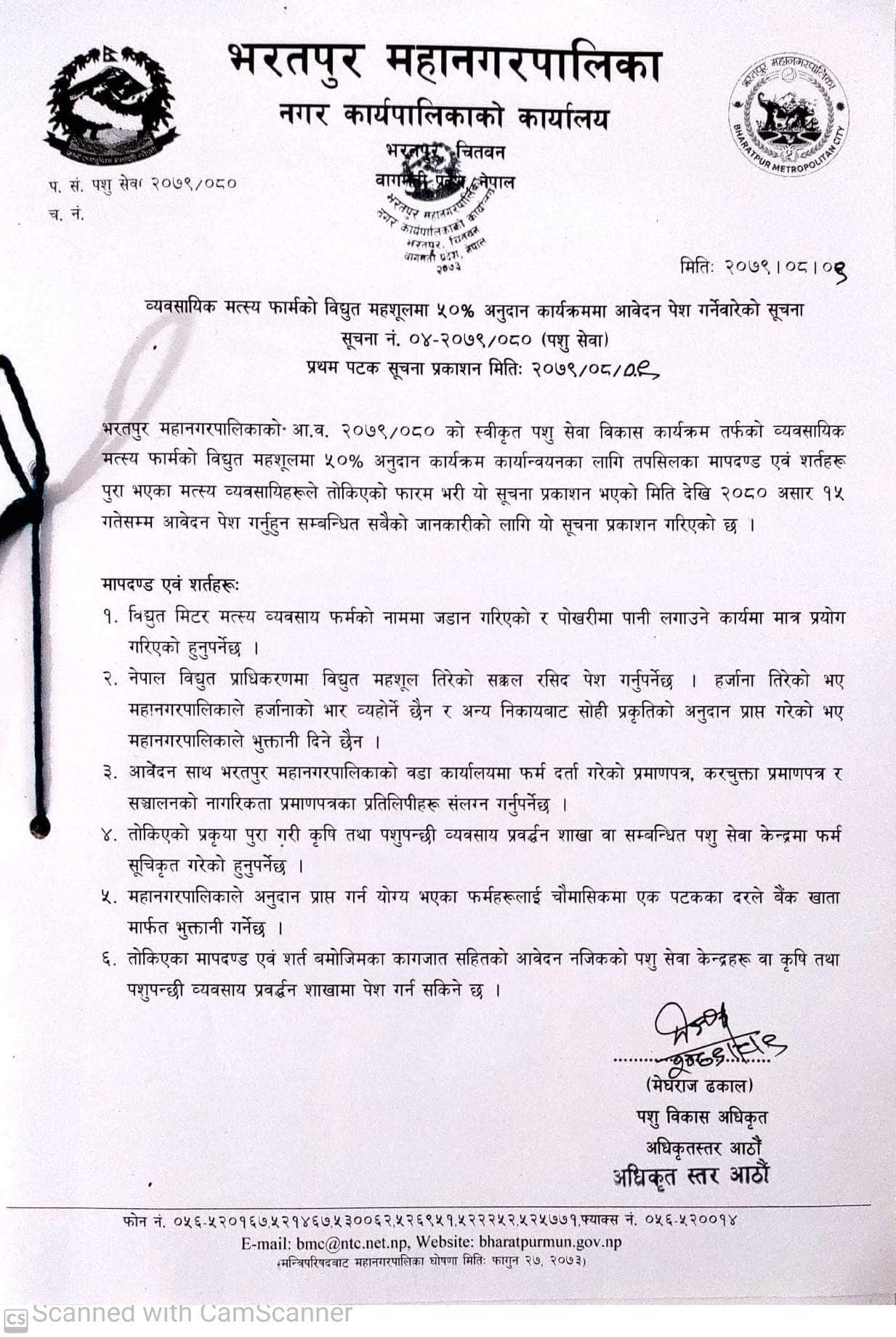 आवेदन दिँदा भरतपुर महानगरपालिकाको वडा कार्यालयमा फर्म दर्ता गरेको प्रमाणपत्र, करचुक्ता प्रमाणपत्र र सञ्चालनको नागरिकता प्रमाणपत्रसहित बुझाउनुपर्नेछ । सबै प्रक्रिया पूरा भएपछि विद्युत प्राधिकरणलाई तिरेको महसुलको ५० प्रतिशत रकम महानगरले व्यवसायीलाई भुक्तान गर्नेछ । योग्य मत्स्य फार्मलाई चौमासिक वा एकै पटक विद्युत महसुल अनुदानको सबै रकम बैंक खातामा भुक्तान गर्ने महानगरले जनाएको छ ।