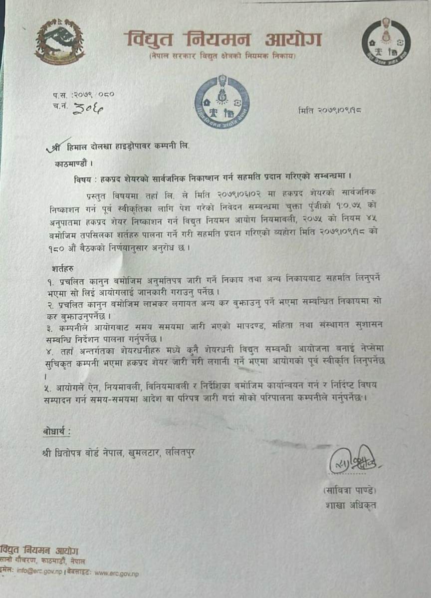 काठमाडौं । इलाम जिल्लाको माई खोलामा २ जलविद्युत आयोजना निर्माण गरी सञ्चालनमा ल्याएको हिमाल दोलखा हाइड्रो पावर कम्पनी लिमिटेडले हकप्रद सेयर निष्कासन अनुमति पाएको छ । विद्युत नियमन आयोगले १ः०.७५ को अनुपातले हकप्रद सेयर निष्कासन गर्न अनुमति दिएको हो ।