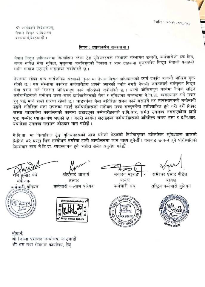 आगामी ३ दिन (७२ घण्टा) भित्र माग सम्बोधन नगरेमा आन्दोलन गर्ने प्राधिकरणलाई ध्यानाकर्षण गराएका छन् । ‘नेपालमा रहेको अन्य सार्वजनिक संस्थाको तुलनामा प्राधिकरणको कार्य अन्यन्तै जोखिमयुक्त रहेको र कर्मचारीहरू आफ्नो ज्यानको पर्वाह नगरी जनतालाई सर्वसुलभ विद्युत सेवा प्रदान गर्न दिनराज जोखिमपूर्ण कार्य गरिरहेका छन्’ ध्यानाकर्षण पत्रमा लेखिएको छ ।
