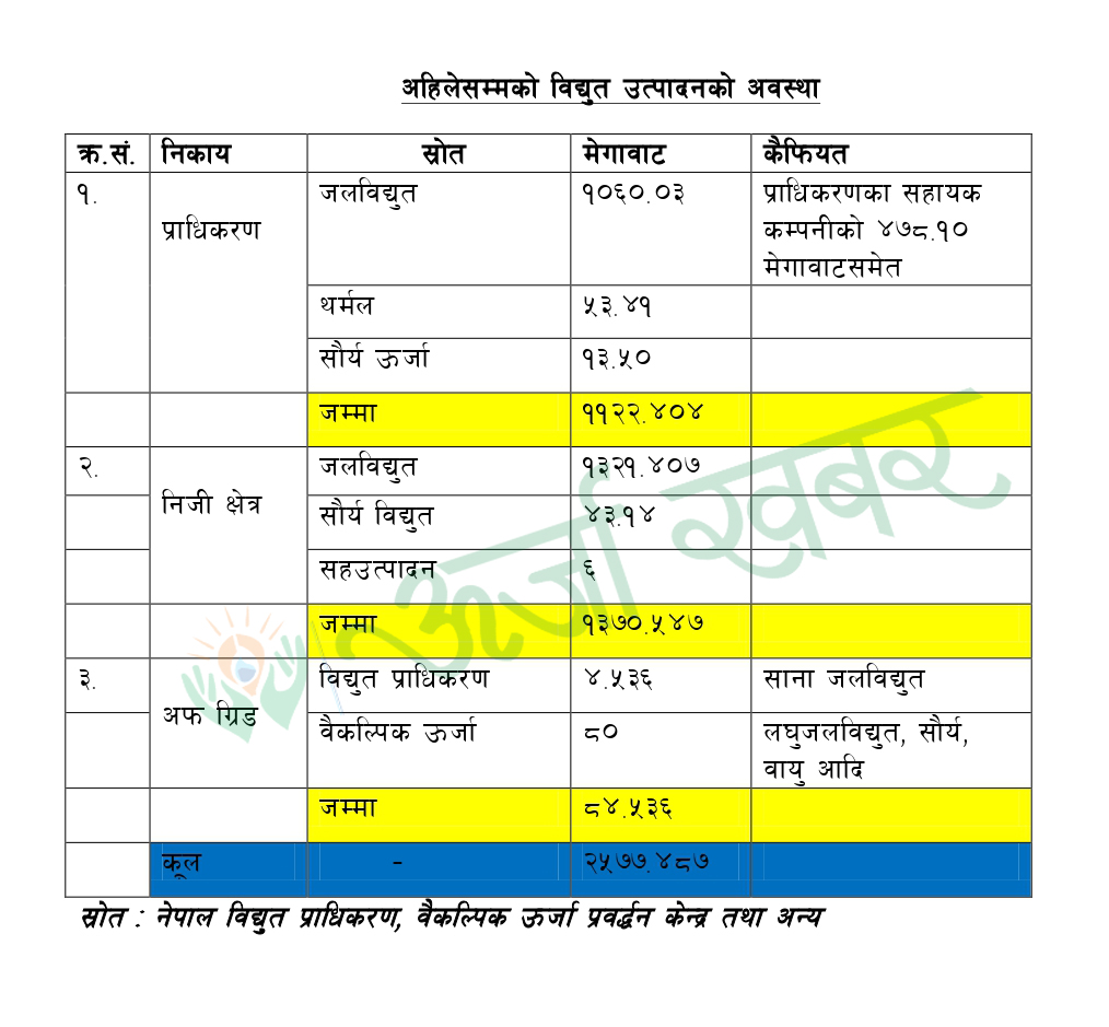 नेपाल विद्युत प्राधिकरण, वैकल्पिक ऊर्जा प्रवर्द्धन केन्द्र र अन्य स्वतन्त्र विद्युत उत्पादकहरूबाट प्राप्त तथ्यांकअनुसार अहिलेसम्म देशको कूल विद्युत उत्पादन २५७७.४८७ पुगेको छ । यसमध्ये केन्द्रीय प्रसारण प्रणालीमा जडित विद्युत क्षमता २४९२.९५१ मेगावाट पुगेको छ भने ग्रिडबाहिर ८४.५३६ मेगावाट रहेको छ ।