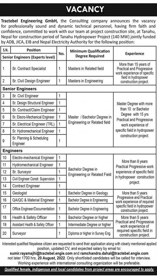 २ जना बरिष्ट इन्जिनियर (विज्ञ तह), ७ जना बरिष्ठ इन्जिनियर र ११ जना इन्जिनियरको रिक्त पदपूर्ति गर्न आवेदन खुलाएको कम्पनीले जनाएको छ । कम्पनीका अनुसार बरिष्ट इन्जिनियर (विज्ञ तह) को लागि सम्बन्धीत विषयमा स्नाकोत्तर तह उत्तिर्ण गरेको वा कम्तीमा पनि १५ वर्षसम्म हइड्रो पावर क्षेत्रमा काम गरेको अनुभव हुनुपर्नेछ ।