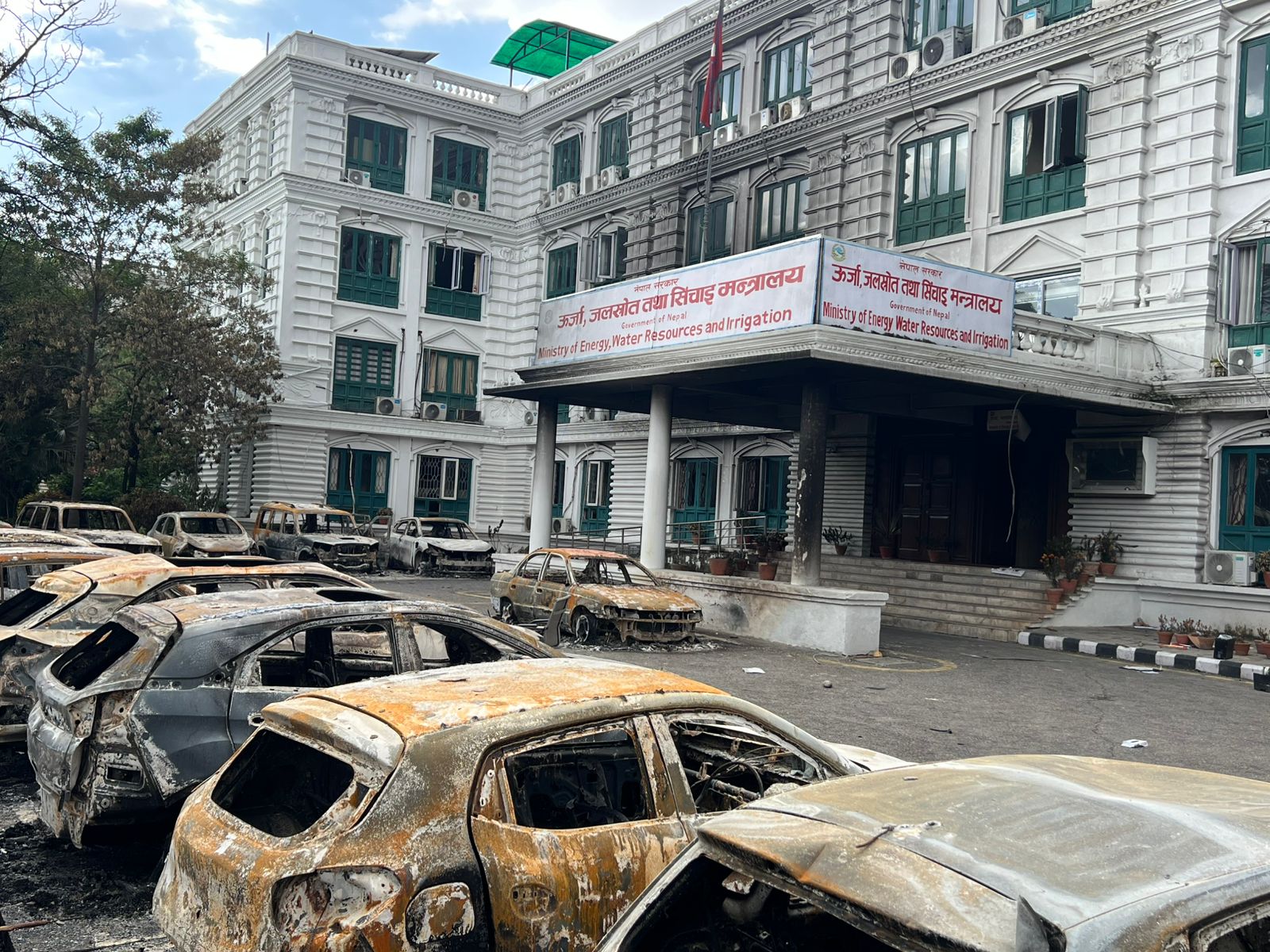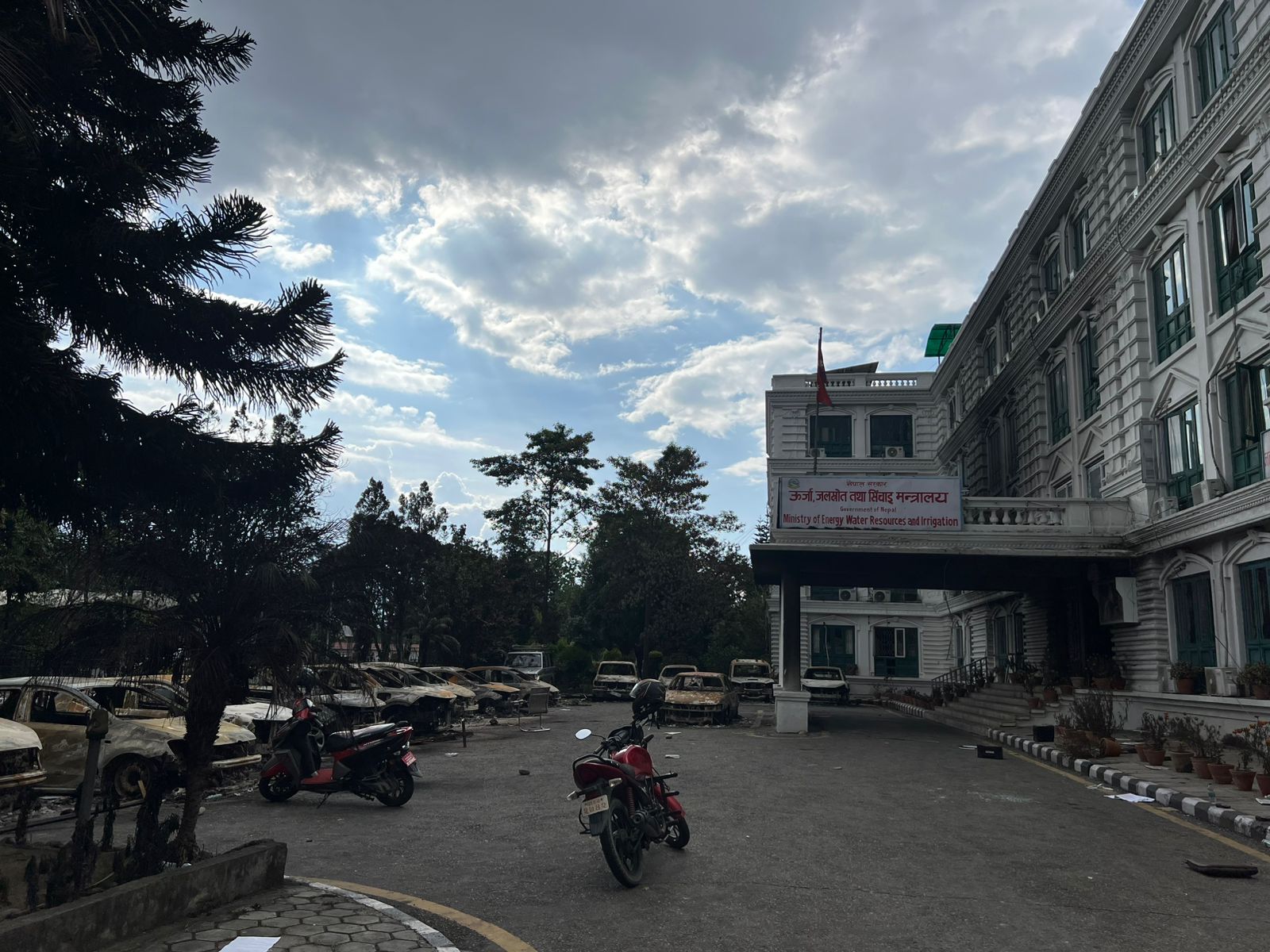 काठमाडौँ । जेन–जेड पुस्ताले गरेको आन्दोलनका दौरान मंगलबारको प्रर्दशनका क्रममा भएको आगजनी तथा तोडफोडका क्रममा सिंहदरबार परिसरभित्र रहेको ऊर्जा, जलस्रोत तथा सिँचाइ मन्त्रालयको भवनमा समेत आंशिक क्षति पुगेको पाइएको छ । भवनका अघिल्ला तथा पछिल्ला भागमा पार्किङ गरिराखिएका चारपाङ्ग्रे तथा दुई पाङ्ग्रे सवारी साधन धेरैजसो जलेर नष्ट भएको ऊर्जा खबरले गरेको स्थलगत अवलोकनमा पाइएको हो । पछिल्लो भागमा राखिएका केही सवारी साधन तथा विद्युतीय चार्जिङ स्टेशन सकुशल रहेका देखिएका छन् ।