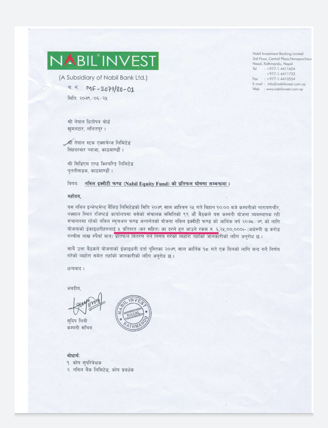 कम्पनी योजना व्यवस्थापक रही सञ्चालनमा रहेको नबिल म्युचअल फण्ड अन्तर्गतको योजना नबिल ब्यालेन्स्ड फण्ड-२ र नबिल इक्वीटी को आर्थिक वर्ष २०७८/७९ को लागि योजनाको ईकाइधनीहरूलाई सो प्रतिफल दिने निर्णय गरेको हो । नबिल ब्यालेन्स्ड फण्ड-२ काे ७ प्रतिशत अर्थात ७ कराेड ८४ लाख रूपैयाँ प्रतिफल वितरण गर्ने निर्णय गरेकाे हाे ।