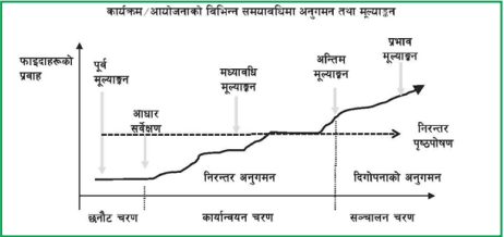 मूल्याङ्कनका चरणमा आयोजना सुरु हुनु अगावै सोको औचित्य, सम्भावित असर र लाभलागत आधारमा पूर्व– मूल्याङ्कन हुनुपर्छ । कार्यक्रम तथा आयोजना कार्यान्वयनको चरणमा गरिने चालू मूल्याङ्कन, कार्यक्रम तथा आयोजना सम्पन्न हुने समयमा वा सम्पन्न भइसकेपछि गरिने कार्य–सम्पन्न मूल्याङ्कन पनि अपरिहार्य छ । उता, कार्यक्रम तथा आयोजना सम्पन्न हुन नसकेको वा न्यून प्रगति भएको सम्बन्धमा गरिने योजना परीक्षण मूल्याङ्कन, कार्यक्रम तथा आयोजना पूर्ण रूपमा सञ्चालनमा आएपछि गरिने प्रभाव मूल्याङ्कन पर्दछन् ।
