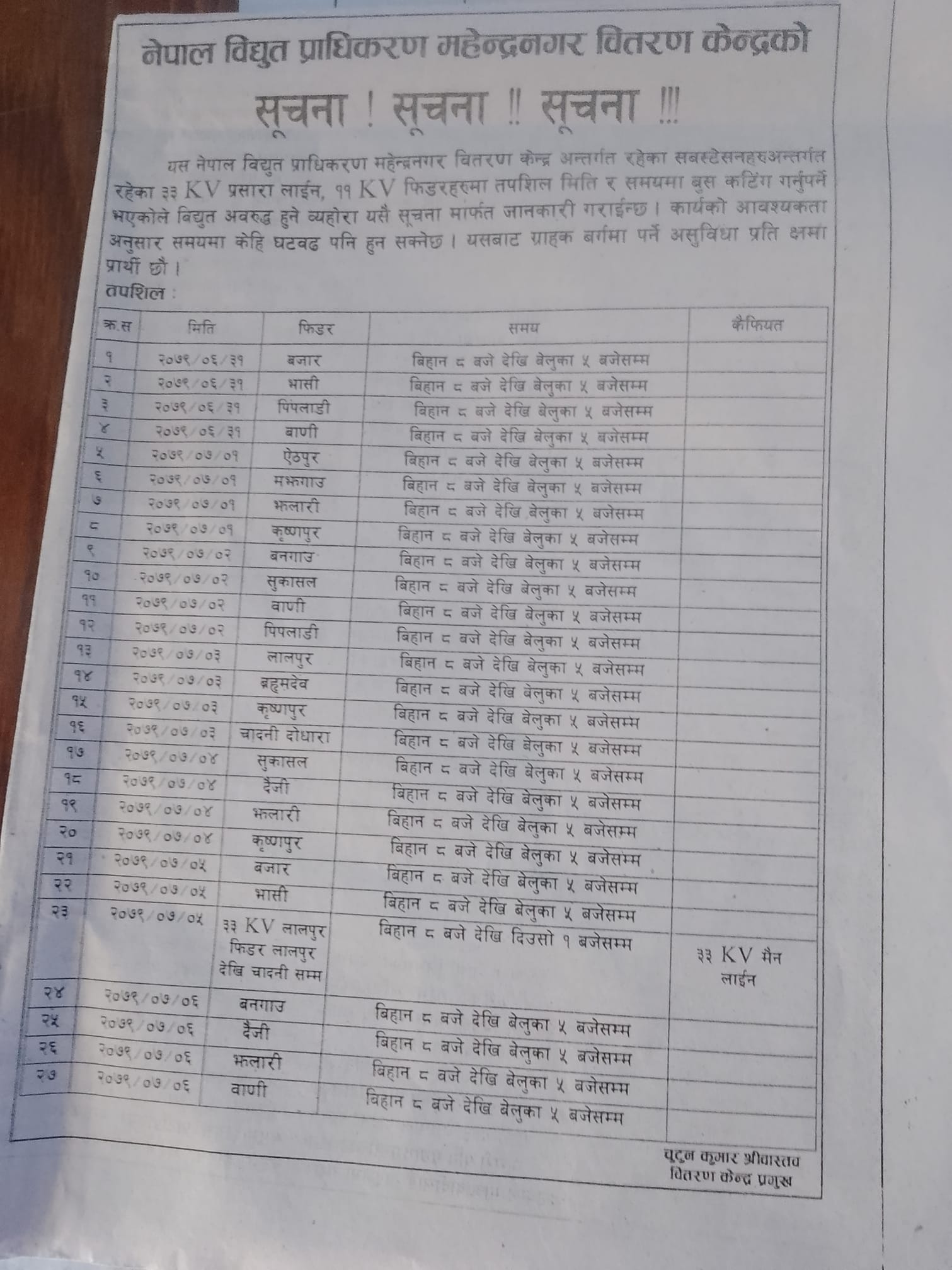 काठमाडौं । नेपाल विद्युत प्राधिकरण महेन्द्रनगर वितरण केन्द्रको विद्युत सेवा आइतबार (कात्तिक ६ गते) सम्मका लागि बन्द भएकाे छ । केन्द्रले महेन्द्रनगर सबस्टेसन अन्तर्गत रहेका ३३ केभी प्रसारण लाइन आसपास रहेको रुखका हाँगाविगाहरू काट्ने (बुस कटिंग) कार्यका लागि सेवा बन्द गरेकाे हो ।