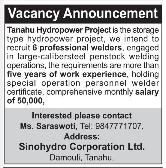 अायाेजनाकाे पेनस्टक पाइप जडान गर्न उक्त कर्मचारी माग गरिएको हो । प्रोफेसनल वेल्डरका लागि कम्तीमा पाँच वर्ष सम्बन्धित क्षेत्रमा काम गरेको अनुभव हुनुपर्नेछ । कम्पनीले तनहुँमा १४० मेगावाटको तनहुँ जलविद्युत जलाशाय आयोजना निर्माण गरिरहेको छ ।