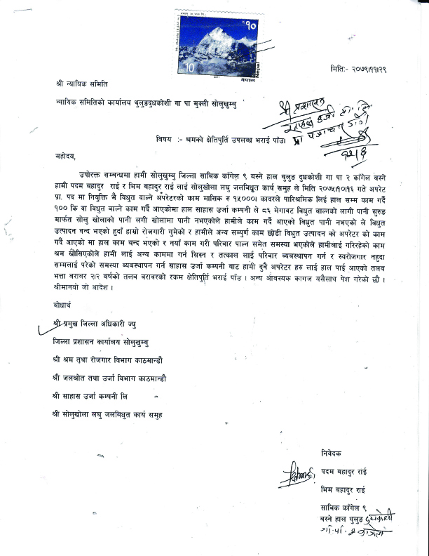लघुजलविद्युत केन्द्र बन्द हुँदा लामो समयदेखि प्राविधिक सञ्चालकका रूपमा कार्यरत पदमबहादुर राई र भीमबहादुर राईले रोजगारी गुमाएका छन् । रोजगारी गुमाएको हुँदा यसको उचित क्षतिपूर्ति माग गर्दै राई द्वयले साहस ऊर्जामा निवेदन दिएका छन् । उनीहरूले २०७५ माघ १६ गतेदेखि केन्द्रमा सञ्चालकको रूपमा कार्यरत रहेको निवेदनमा उल्लेख छ । राई द्वयले रोजगारीको क्षतिपूर्ति बापत २-२ वर्षको तलब बराबरको रकम माग गरेको पनि निवेदनमा खुलाएका छन । उनीहरूले केन्द्रमा मासिक १५-१५ हजार रुपैयाँ तलबमा काम गरेको निवेदनमा जनाएका छन् ।