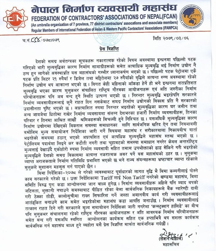 निरन्तर भइरहेको मूल्यवृद्धिका कारण घर, जमिन तथा अन्य जायजेथा धितोमा राखेर निर्माण व्यवसायमा संलग्न देशभरका हजारौँ निर्माण व्यवसायी, तिनका परिवार र तिनमा आश्रित लाखौँ श्रमिकको बिचल्ली हुने अवस्था आएको विज्ञप्तिमा उल्लेख छ ।