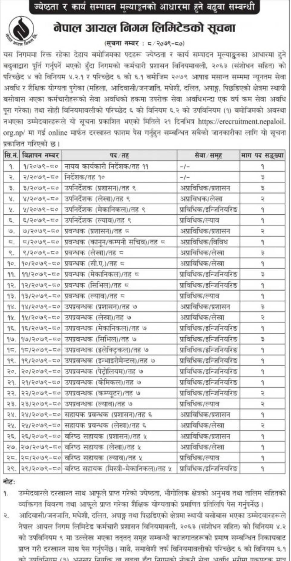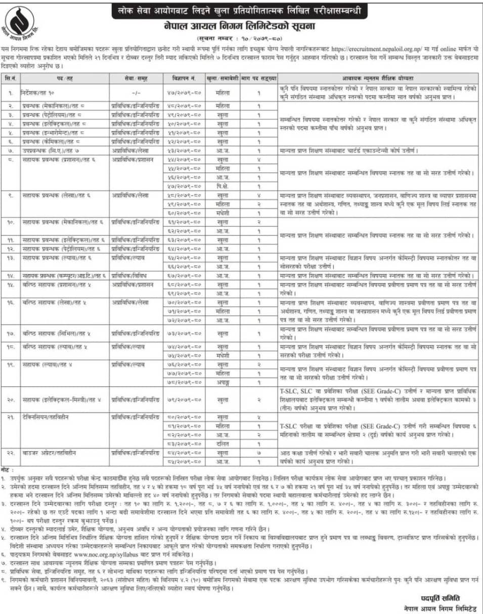 काठमाडौं । नेपाल आयल निगमले विभिन्न रिक्त पदपूर्ति गर्न आवेदन माग गरेको छ । लोकसेवा आयोगबाट लिइने प्रतियोगितात्मक लिखित परीक्षा मार्फत पद पूर्ति गर्न आवेदन माग गरेको हो ।