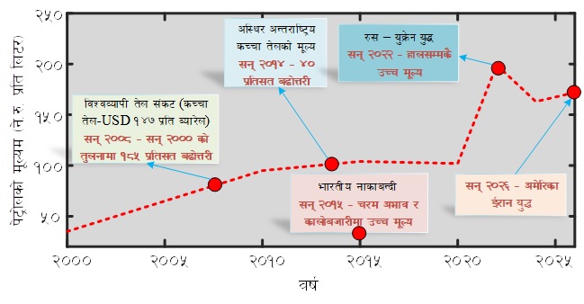 उदाहरणका लागि सन् २००० देखि २०२२ सम्म देखा परेका विश्वव्यापी सङ्कटले अन्तर्राष्ट्रिय बजारमा पेट्रोलियमको मूल्यमा उच्च वृद्धि भएको देखिन्छ । यस अवधिमा नेपालमा पेट्रोलियमको मूल्य हालसम्मकै उच्चतम बिन्दुमा पुगेको थियो, जहाँ पेट्रोलको मूल्य करिब ४७० प्रतिशतले वृद्धि भएको देखिन्छ । तुलनात्मक रूपमा, यही अवधिमा अन्तर्राष्ट्रिय बजारमा पेट्रोलको मूल्य करिब २६० प्रतिशतले बढेको थियो ।२