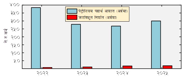 यद्यपि, यो उपलब्धि महत्त्वपूर्ण भए पनि विद्युत् निर्यातको परिमाण अझै पेट्रोलियम आयातको तुलनामा निकै कम छ । आयातित पेट्रोलियमको ठूलो हिस्सा यातायात, औद्योगिक उत्पादन, निर्माण कार्य तथा घरायसी प्रयोजनका लागि (एलपिजी) खपत हुने गरेको छ । पछिल्ला दिनमा विशेषगरी सहरी क्षेत्रमा विद्युतीय चुलाे तथा विद्युतीय सवारी साधन (इभी) प्रति आकर्षण बढ्दै गएको छ । आयातित पेट्रोलियम इन्धनलाई प्रतिस्थापन गर्ने दिशामा यो सकारात्मक सङ्केत हो । यदि यो प्रवृत्तिलाई थप प्रोत्साहन गर्न सकियो भने भविष्यमा यातायात क्षेत्र विद्युत् ऊर्जाबाट सञ्चालन हुने सम्भावना बढ्ने छ ।