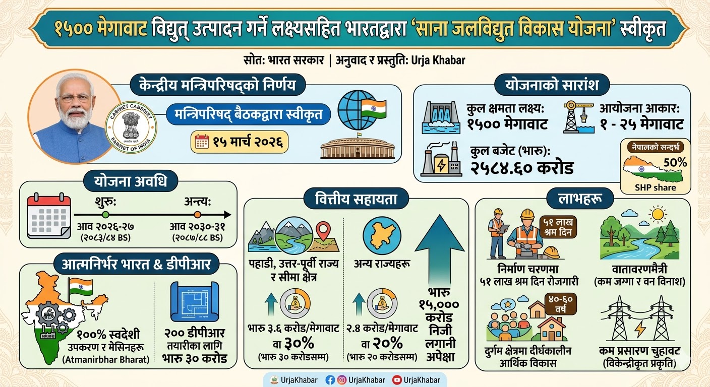 काठमाडौँ । भारतीय प्रधानमन्त्री नरेन्द्र मोदीको अध्यक्षतामा बसेको केन्द्रीय मन्त्रिपरिषद् बैठकले ‘साना जलविद्युत् विकास योजना’ स्वीकृत गरेको छ । ४ वर्षसम्म लागु हुने गरी यस्तो योजना स्वीकृत गरिएको हो ।
