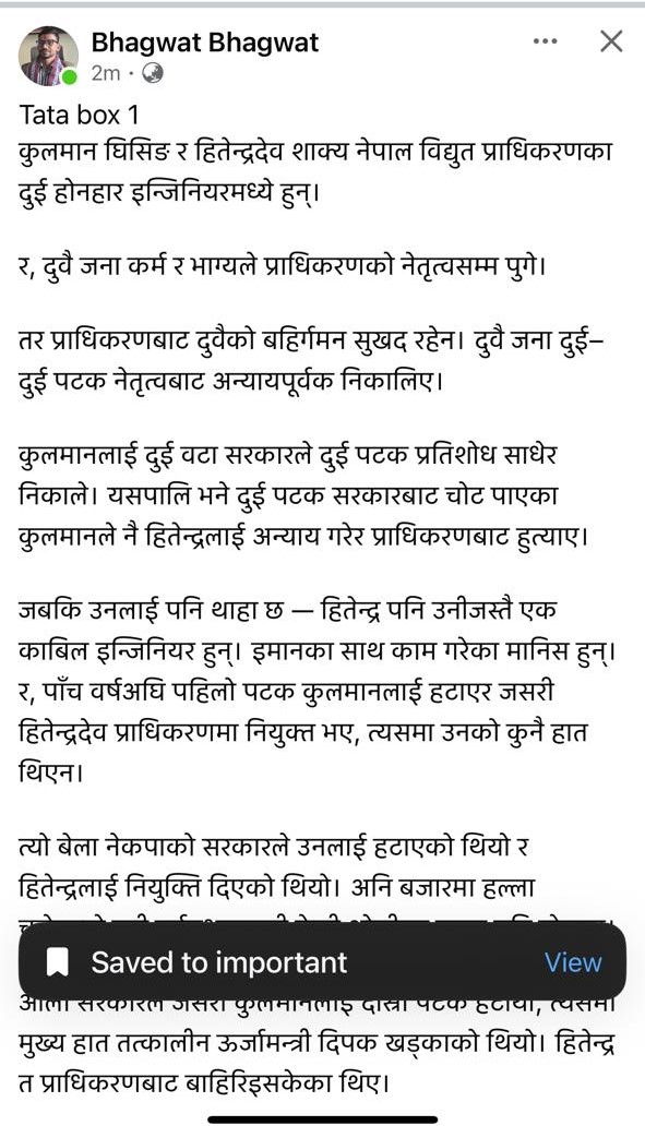 आर्थिक पत्रकार समाज, नेपाल (सेजन) का अध्यक्ष भागवत भट्टराईले फेसबुकमा लेखेका छन् – कुलमान घिसिङ र हितेन्द्रदेव शाक्य नेपाल विद्युत प्राधिकरणका दुई होनहार इन्जिनियरमध्ये हुन् । र, दुवै जना कर्म र भाग्यले प्राधिकरणको नेतृत्वसम्म पुगे तर प्राधिकरणबाट दुवैको बहिर्गमन सुखद रहेन । दुवै जना दुई–दुई पटक नेतृत्वबाट अन्यायपूर्वक निकालिए । कुलमानलाई पनि प्रतिशोध साँधेर निकाले । यसपालि भने पहिले सरकारबाट चोट पाएका कुलमानले नै हितेन्द्रलाई अन्याय गरेर प्राधिकरणबाट हुत्याए ।