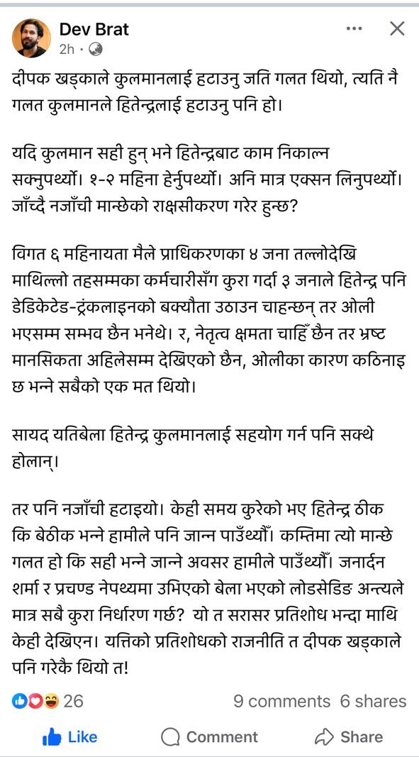 कवि देवब्रत लेख्छन् – दीपक खड्काले कुलमानलाई हटाउनु जति गलत थियो, त्यति नै गलत कुलमानले हितेन्द्रलाई हटाउनु पनि हो । यदि, कुलमान सही हुन् भने हितेन्द्रबाट काम निकाल्न सक्नुपर्थ्यो । १–२ महिना हेर्नु पर्थ्यो । अनि मात्र एक्सन लिनुपर्थ्यो । जाँच्दै नजाँची मान्छेको राक्षसीकरण गरेर हुन्छ ? विगत ६ महिनायता मैले प्राधिकरणका ४ जना तल्लोदेखि माथिल्लो तहसम्मका कर्मचारीसँग कुरा गर्दा ३ जनाले हितेन्द्र पनि डेडिकेटेड–ट्रंक लाइनको बक्यौता उठाउन चाहन्छन् तर ओली भएसम्म सम्भव छैन भने थे । र, नेतृत्व क्षमता चाहिँ छैन तर भ्रष्ट मानसिकता अहिलेसम्म देखिएको छैन, ओलीका कारण कठिनाइ छ भन्ने सबैको एक मत थियो ।