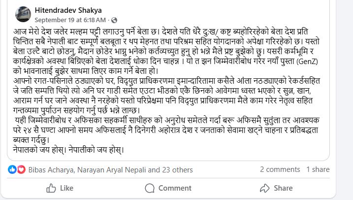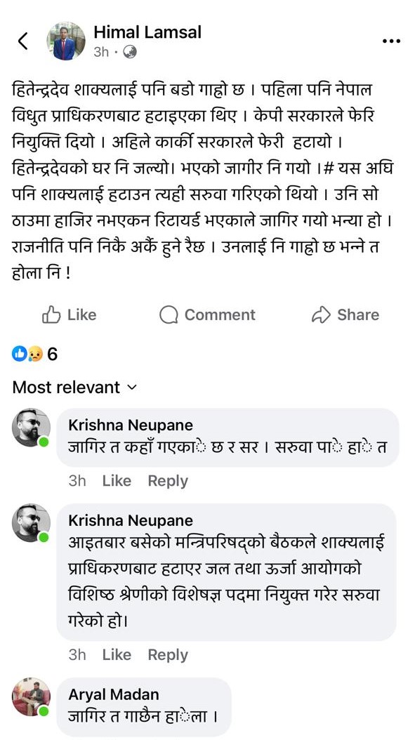 यसैगरी, राष्ट्रिय समाचार समिति (रासस) का पत्रकार हिमाल लम्साल फेसबुकमा लेख्छन् – हितेन्द्रदेव शाक्यलाई पनि बडो गाह्रो छ । पहिला पनि नेपाल विद्युत् प्राधिकरणबाट हटाइएका थिए । केपी सरकारले फेरि नियुक्ति दियो । अहिले कार्की सरकारले फेरि हटायो । हितेन्द्रदेवको घर नि जल्यो । भएको जागिर नि गयो । यसअघि पनि शाक्यलाई हटाउन त्यही सरुवा गरिएको थियो । उनि सो ठाउमा हाजिर नभइकन रिटायर्ड भएकाले जागिर गयो भन्या हो । राजनीति पनि निकै अर्कै हुने रैछ । उनलाई नि गाह्रो छ भन्ने त होला नि !