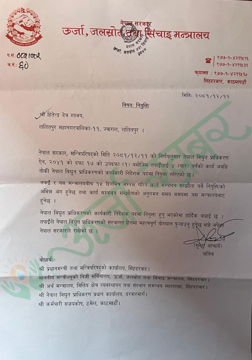 केपी शर्मा ओली सरकारको २०८१ साल चैत ११ गतेको निर्णयअनुसार शाक्यलाई ४ वर्षका लागि प्राधिकरणको जिम्मेवारी दिने निर्णय गरेको थियो । शाक्यको नियुक्तिपत्रमा लेखिएको छ– नेपाल सरकार, मन्त्रिपरिषद्को मिति २०८१/१२/११ को निर्णयानुसार नेपाल विद्युत् प्राधिकरण ऐन, २०४१ को दफा १७ को उपदफा (१) बमोजिम तपाईंलाई ४ (चार) वर्षको कार्य अवधि तोकी नेपाल विद्युत् प्राधिकरणको कार्यकारी निर्देशक पदमा नियुक्ति गरिएको छ ।