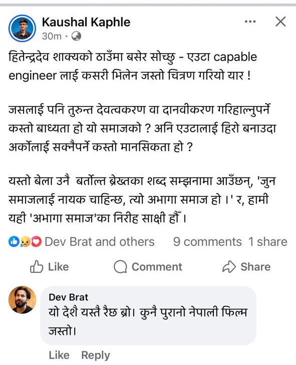 विद्युत् क्षेत्रमा शाक्यलाई भिलेनजस्तो व्यवहार गरिएको भन्दै अनलाइन खबरका कौशल काफ्लेको प्रतिक्रिया छ – हितेन्द्रदेव शाक्यको ठाउँमा बसेर सोच्छु – एउटा अबउबदभि भलनष्लभभच लाई कसरी भिलेनजस्तो चित्रण गरियो यार ! जसलाई पनि तुरुन्त देवत्वकरण वा दानवीकरण गरिहाल्नु पर्ने कस्तो बाध्यता हो यो समाजको ? अनि एउटालाई हिरो बनाउदा अर्कोलाई सक्नै पर्ने कस्तो मानसिकता हो ? यस्तो बेला उनै बर्तोल्त ब्रेख्तका शब्द सम्झनामा आउँछन्, ‘जुन समाजलाई नायक चाहिन्छ, त्यो अभागा समाज हो ।’ र, हामी यही ‘अभागा समाज’का निरीह साक्षी हौँ ।