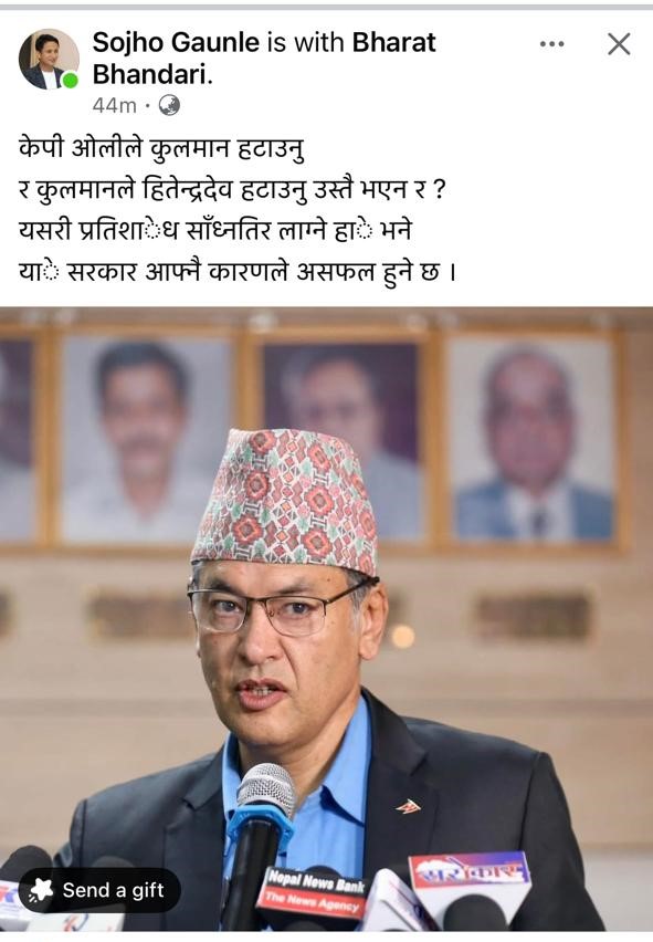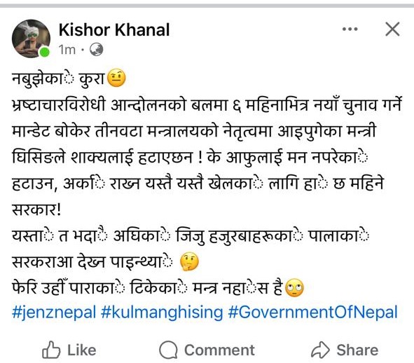 फोटो पत्रकार किशोर खनालको भनाइ छ – नबुझेको कुरा, भ्रष्टाचारविरोधी आन्दोलनको बलमा ६ महिनाभित्र नयाँ चुनाव गर्ने म्यान्डेट बोकेर तीन वटा मन्त्रालयको नेतृत्वमा आइपुगेका मन्त्री घिसिङले शाक्यलाई हटाएछन् ! के आफूलाई मन नपरेको हटाउन, अर्काे राख्न यस्तै–यस्तै खेलका लागि हो ६ महिने सरकार ? यस्तो त भदौ अघिको जिजु हजुरबाहरूको पालाको सरकराआँ देख्न पाइन्थ्यो । फेरि उही पाराको टिकेको मन्त्र नहोस् है !