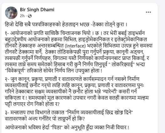 उनले कानुनी तथा प्रक्रियागत छिद्रहरू टाल्नेतर्फ सरकारको ध्यान जानुपर्ने बताएका छन् । ‘मन्त्रालय तथा विभागले तत्काल ‘निर्माण व्यवसायीलाई छिद्र खोज्न दिने’ वातावरणको अन्त्य गर्नतिर पो लाग्नुपर्ने हो कि ?,’ उनले भनेका छन् । आयोजनाको भविष्य देखेर पीडाबोध भएपछि आफूले आफ्नो निजी विचार व्यक्त गरेको समेत उनले प्रस्ट्याएका छन् ।