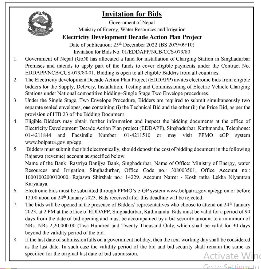 आइतबार (पुस १० गते) चार्जिङ स्टेसन निर्माणका लागि ठेक्का आह्वान गरेको छ । सुचनाका अनुसार स्वदेशी कम्पनीले मात्रै ठेक्का आवेदन दिन सक्नेछन् । इच्छुकले २४ जनवरी (माघ १० गते) सम्म आवेदन दिन सक्नेछन् । यो स्टेसनमा साना कारहरू मात्रै चार्ज गर्न सकिनेछ । एकदेखि डेढ घन्टामा फुल चार्ज गर्न सकिनेछ ।