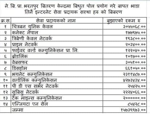 प्राईम नेटवर्कबाट २ लाख ३४ हजार, फाइबर वल्र्ड कम्युनिकेसन प्रालिबाट १ लाख २२ हजार ४० रुपैयाँ, ब्रोडलिंकबाट १ लाख १ हजार ७ सय, वेबसफरबाट ३ लाख ५ हजार १ सय, डिसहोमबाट ६ लाख ६१ हजार ५० रुपैयाँ असुल गरेको केन्द्रले जनाएको छ ।