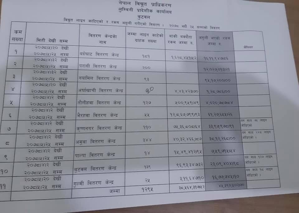 यस्तै, १ महिनाको अवधिमा परासी वितरण केन्द्रले २०० ग्राहकको लाइन काटी १ करोड २० लाख २७ हजार १३ रुपैयाँ, नयामिल वितरण केन्द्रले ९३ जना ग्राहकबाट ९५ करोड १७ लाख २० हजार रुपैयाँ, तौलीहवा वितरण केन्द्रले १२७ ग्राहकबाट ४० लाख २० हजार ७ सय ८७ रुपैयाँ, भैरवा वितरण केन्द्रले ५५ जना ग्राहकबाट ६१ लाख २७ हजार ६ सय ५५ रुपैयाँ असुल गरेकाे छ ।