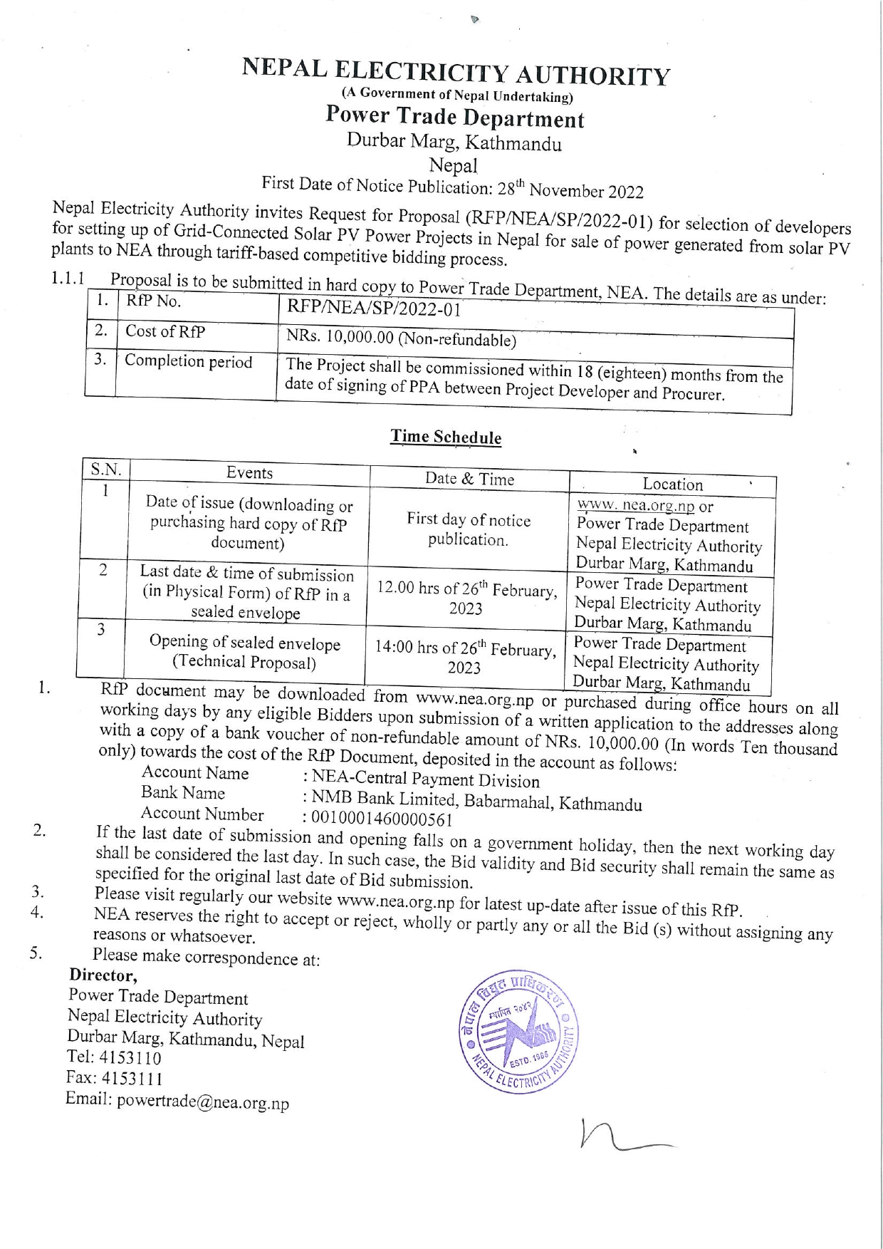 इच्छुकले २०७९ फागुन १४ गते अर्थात ९० दिनभित्र प्रस्ताव पेश गर्नुपर्नेछ । प्राधिकरणले २०७५ असार २६ गतेको निर्णय अनुसार प्रतियुनिट ७.३० रुपैयाँमा पीपीए गर्दै आएपनि अब नयाँ दर ५.९४ रुपैयाँमा पीपीए हुने प्राधिकरणले जनाएको छ ।