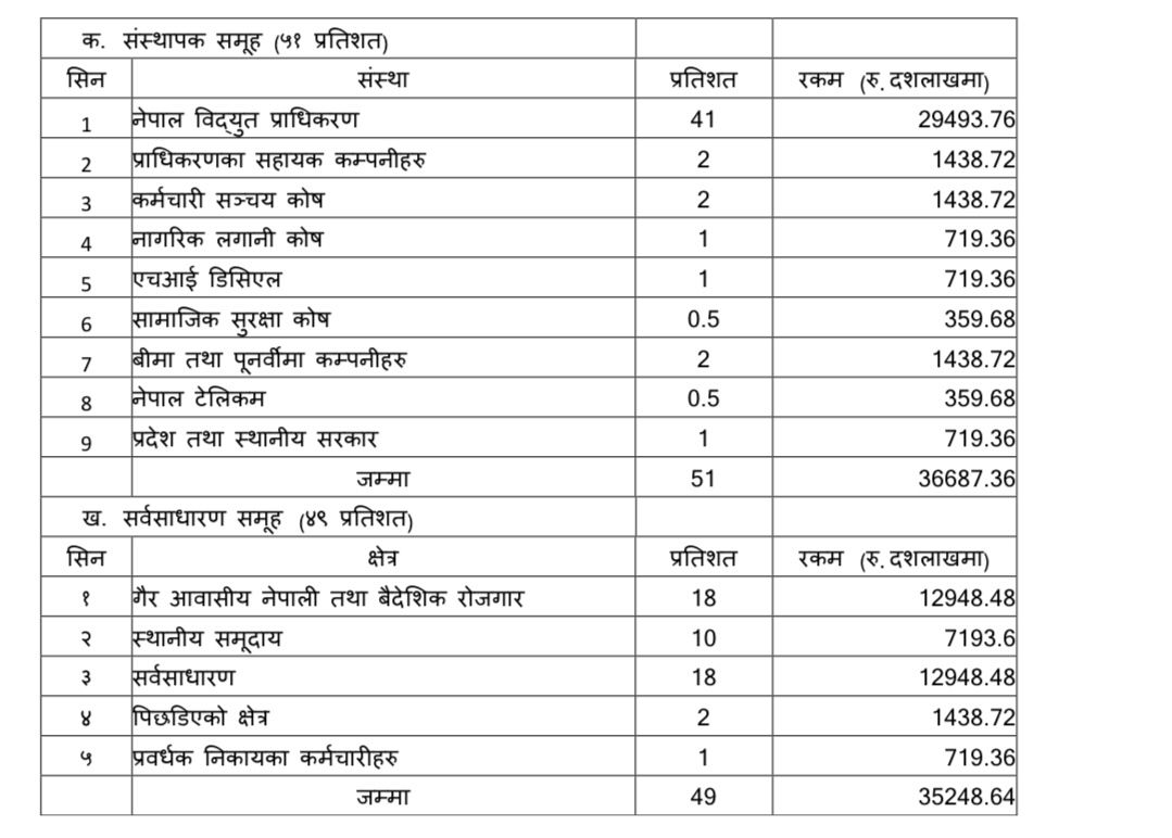आयोजनाको प्रवर्धक कम्पनीमा प्राधिकरणको ४१ प्रतिशत संस्थापक सेयर अर्थात २९ अर्ब ४९ करोड रुपैयाँको लगानी रहनेछ । १ अर्ब ४४ करोड/१ अर्ब ४४ करोड (२/२ प्रतिशत) प्राधिकरणका सहायक कम्पनी, कर्मचारी सञ्चय कोष एवम् बीमा तथा पुनर्बीमा कम्पनीको, ७१ करोड ९३ लाख लाख/७१ करोड ९३ लाख लाख (१ प्रतिशत) नागरिक लगानी कोष, एचआइडिसिएल, प्रदेश एवम् स्थानीय सरकारको र ३५ करोड ९७ लाख/३५ करोड ९७ लाख रुपैयाँ (०.५/०.५ प्रतिशत) नेपाल टेलिकम तथा सामाजिक सुरक्षाको कोषको संस्थापक लगानी रहनेछ ।