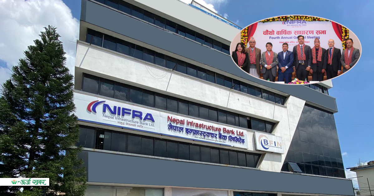 काठमाडौं । नेपाल इन्फ्रास्टक्चर बैंक लिमिटेड (निफ्रा) ले आफ्ना सेयरधनी सदस्यहरूलाई चुक्ता पूँजीको ४.२१०५ प्रतिशत अर्थात करिब ९१ करोड रुपैयाँ नगद लाभांश दिने प्रस्ताव पारित गरेको छ । कम्पनीको मंसिर १० गते (शनिबार) भएको चौथो साधारण सभाले प्रस्ताव पारित गरेको हो ।