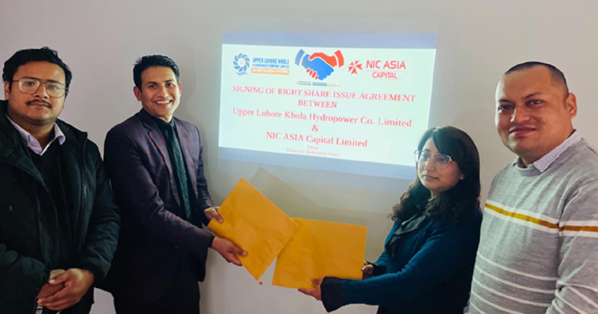 अपर लोहोरे खोला हाइड्रोपावर कम्पनी लिमिटेडको हकप्रद सेयर निष्कासन तथा बिक्री प्रबन्धकमा एनआइसी एसिया क्यापिटल लिमिटेड नियुक्त भएको छ । दुई कम्पनीबीच भएको नियुक्ति सम्झौता पत्रमा अपर लोहोरे खोलाका प्रमुख कार्यकारी अधिकृत सदिच्छा कार्की र एनआइसी एसिया क्यापिटलका प्रमुख कार्यकारी अधिकृत रामेन्द्र रायमाझीले हस्ताक्षर गरेका छन् ।