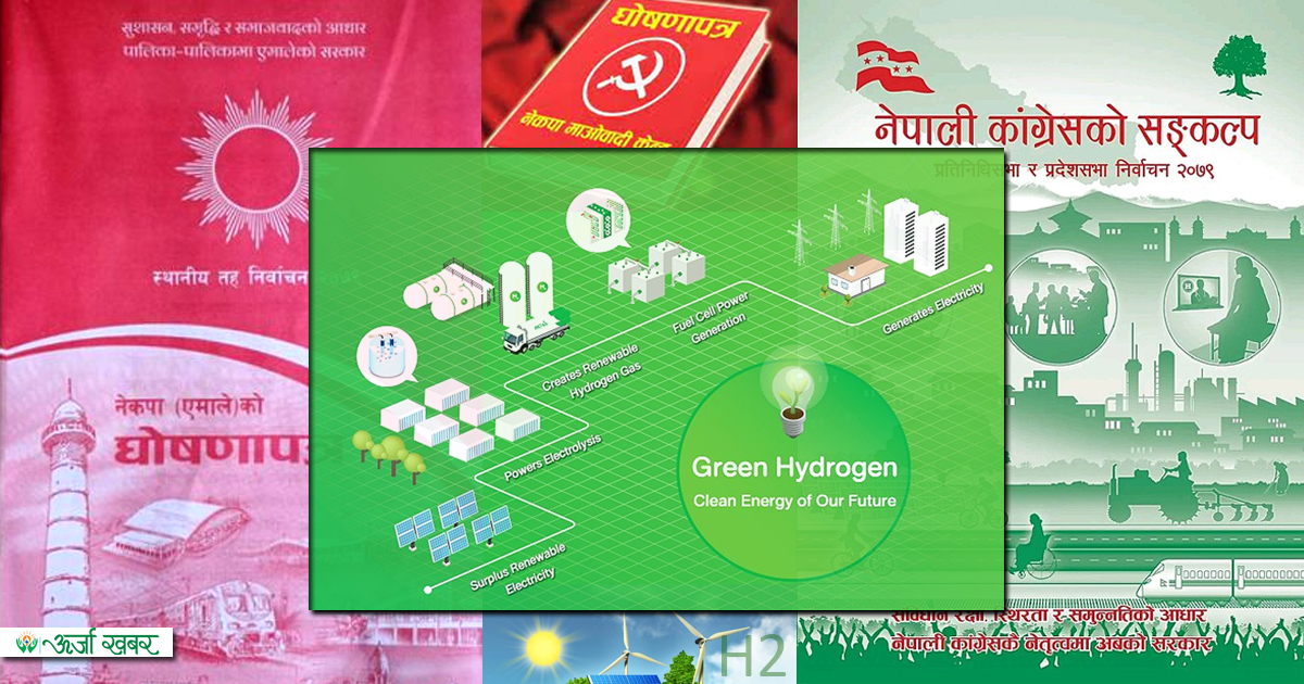 नेपालमा उत्पादन भएको विद्युत खपत बढाउन हाइड्रोजन उत्पादन गर्ने तथा वातावरणीय र आर्थिक हिसाबले प्रगति हासिल गर्न सकिने उल्लेख गर्दै राजनीतिक दलहरूले घोषणापत्र सार्वजनिक गरेका छन् । दलहरूले सार्वजनिक गरेको प्रतिवद्धतापत्रमा हाइड्रोजन उत्पादनदेखि प्लान्ट स्थापना गर्ने विषय समेटिएको छ ।