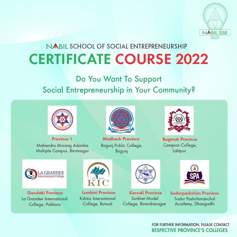 सामाजिक उद्यमशिलता प्रवर्द्धन गर्न सञ्चालन गरिएको नबिल स्कुल अफ सोशियल इन्टरपे्रनरशिप अन्तर्गतका फेलोशिप कार्यक्रम र प्रमाणपत्र कार्यक्रम मध्ये प्रमाणपत्र कार्यक्रमको पहिलो ब्याचका लागि आवेदन माग गरिएको हो ।