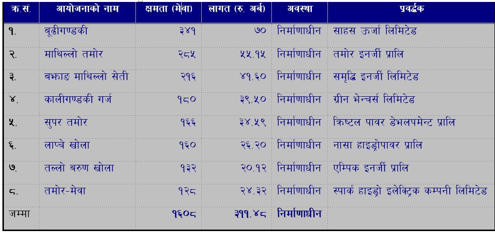 स्वदेशी लगानीमै निर्माणाधीन १०० मेगावाटभन्दा ठूला आयोजनाहरू