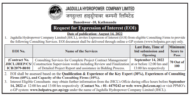 आयोजनाको ठेक्का व्यवस्थापन, निर्माण कार्यको सुपरभिजन, बिडिङ डकुमेन्ट लगायतको काम लागि परामर्शदाता नियुक्त गर्न लागिएको कम्पनीले जनाएको छ । कम्पनीका अनुसार इच्छुक योग्यता पुग्ने कम्पनीले आगामी भदौ २९ गतेसम्म आवेदन दिन सक्नेछन् ।