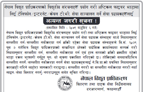 ‘सेवा प्रदायकहरूलाई विद्युतीय संरचना उपयोगका लागि नियमानुसार सम्झौता गर्न बोलाइएको छ’, सूचनामा भनिएको छ ‘सम्झौता गर्न नआउनेलाइ प्राधिकरणको नियमाअनुसार कारबाही गरिनेछ ।’
