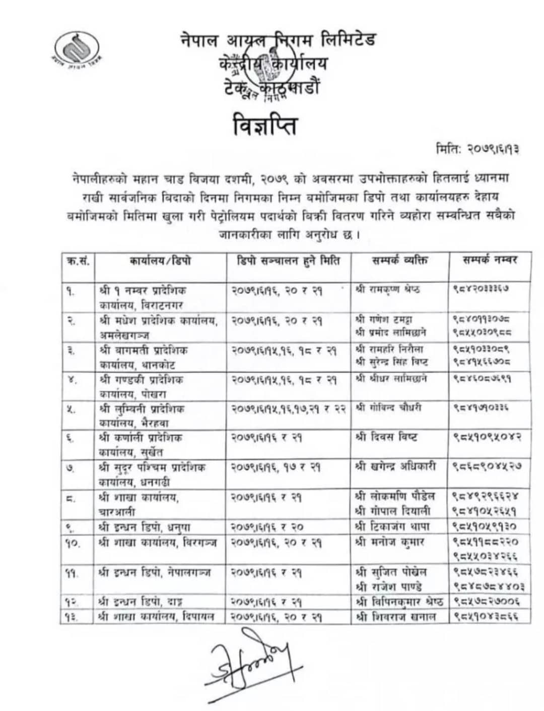 निगमले सूचना जारी गर्दै पेट्रोल पम्प सँगैे सहज आपूर्तिका लागि दसैँ बिदामा १३ वटा डिपोहरू खुल्ला रहने जानकारी दिएको छ । दसैँमा सार्वजनिक बिदा हुने र सार्वजनिक यातायातको चाप बढ्ने भएकाले पप्पहरू खुल्ला राख्न निगमले यस्तो निर्णय गरेको हो ।