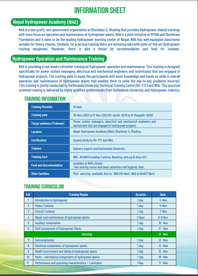 तालिममा जलविद्युत सम्बन्धि जानकारी र आयोजनाहरू सञ्चालन गर्दा आइरहने समस्याहरूको समाधानका उपायहरू सम्बन्धि जानकारी दिइनेछ । तालिम आगामी कात्तिक १९ गतेदेखि मंसिर १ गतेसम्म धादिङको धुनीबेसीमा हुनेछ । तालिम काठमाडौं युनिभरसिटी टेक्निकल टे«निङ सेन्टर (केयूटीटीएस) र एनएचएले सयुक्त रुपमा सञ्चालन गर्नेछन् ।