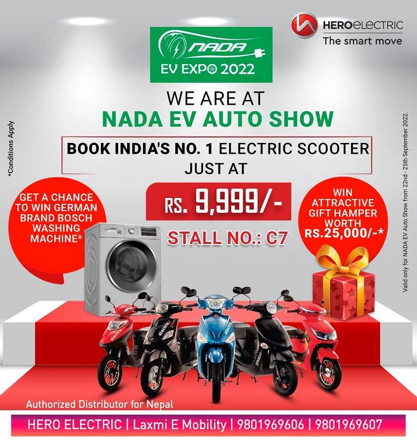 काठमाडौं । भारतमा उत्पादित हिरो इलेक्ट्रिक स्कुटरको नेपालका लागि आधिकारिक विक्रेताका रूपमा लक्ष्मी इलेक्ट्रिक मोविलिटीले ‘नाडा इभी अटो सो’ मा हिरो इलेक्ट्रिक स्कुटर बुकिङ गर्नेलाई २५ हजार रुपैयाँ पुरस्कार अफर ल्याएको छ ।